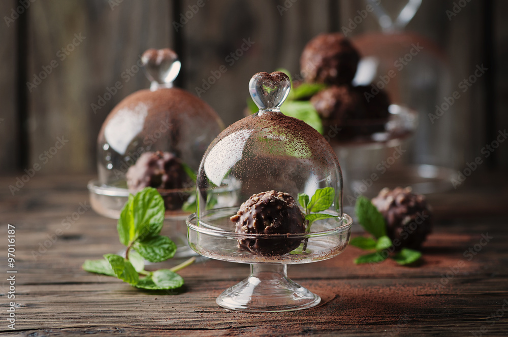Chocolate sweets with nuts, mint and cacao on the vintage table