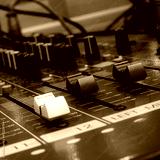 Professional analog audio mixing console with knobs and slides for music and recording equipment,Blurred background and close-up.