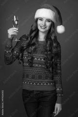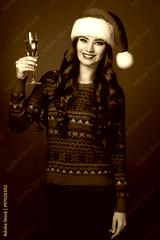 Portrait of a beautiful woman wearing a santa hat smiling, drinking champagne with glasses