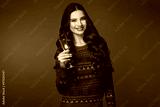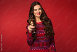 Portrait of a beautiful woman wearing warm sweater smiling, drinking champagne with glasses