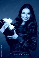 beautiful woman with a Christmas gift box, curly brunette woman in a warm sweater, on red background