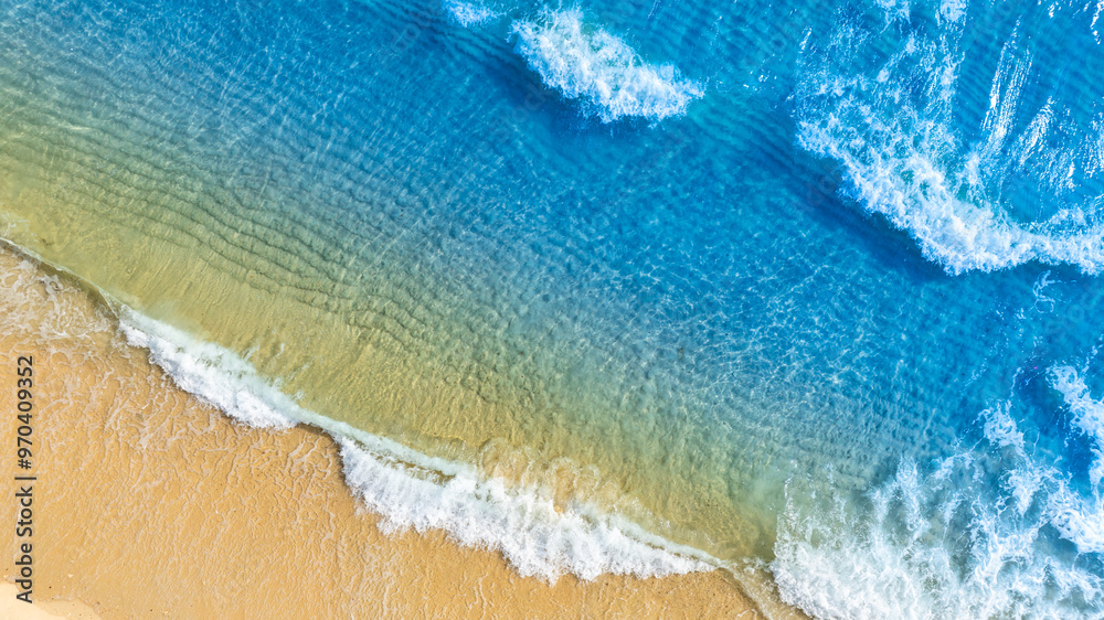 Top view beach sand background for summer vacation concept. Beach nature and summer seawater with sunlight light sandy beach Sparkling sea water