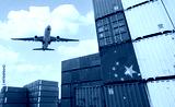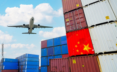 China export industry and global supply chain. Cargo airplane flying over logistic containers. Air logistics, shipping business, and merchandise export. Trade agreements and geopolitical implications.