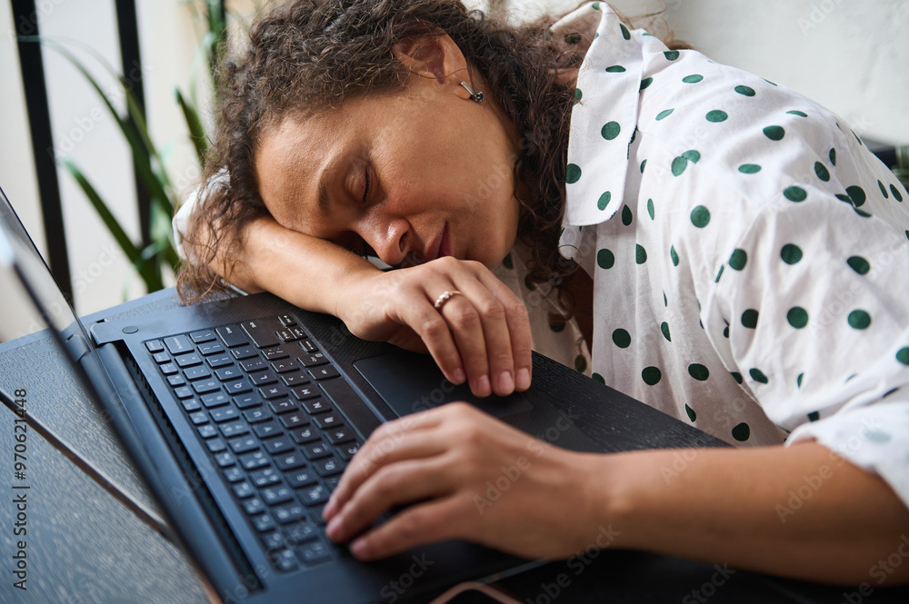 Woman sleeping at a desk on laptop, exhausted from work, wearing a polka dot shirt, representing fatigue and burnout in the workplace.