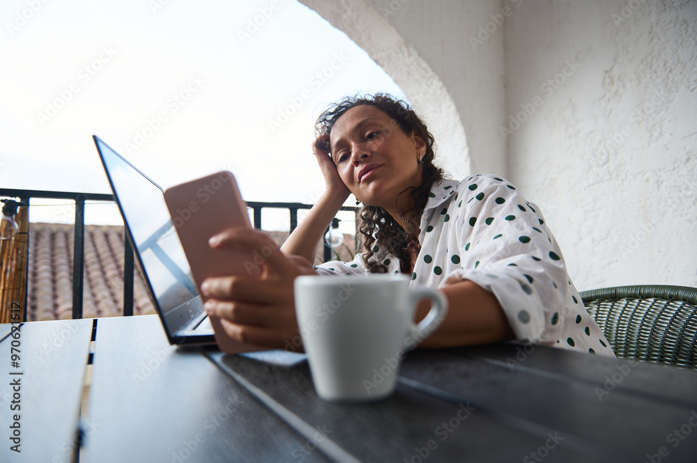 Woman in polka dot shirt using smartphone and laptop on patio, enjoying leisure time with coffee and technology