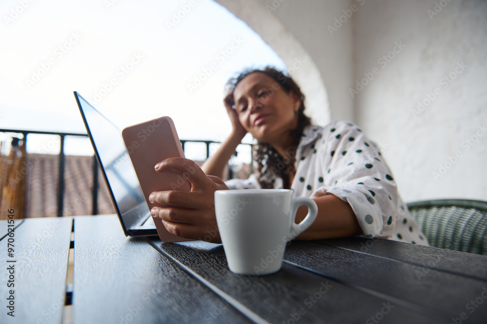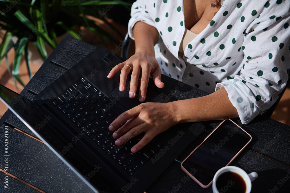 Woman in polka dot shirt working on laptop at outdoor table with smartphone and coffee cup beside her