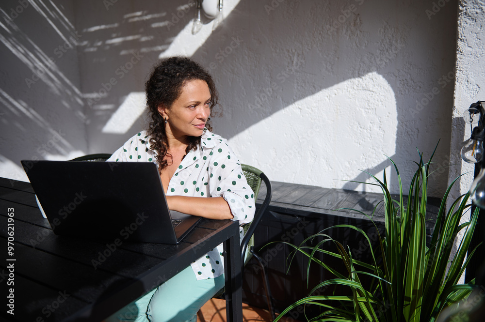 Confident woman working remotely on laptop in sunny outdoor setting, embracing productivity and focus