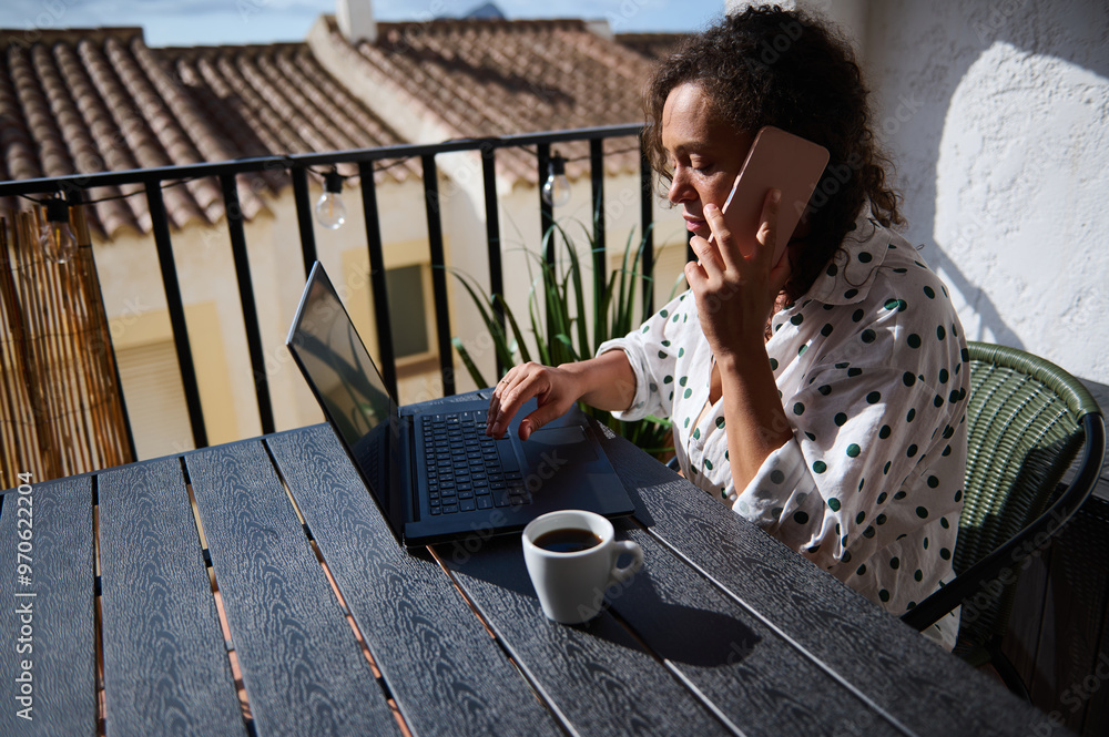 Woman working remotely on laptop while talking on phone at sunny outdoor patio with coffee
