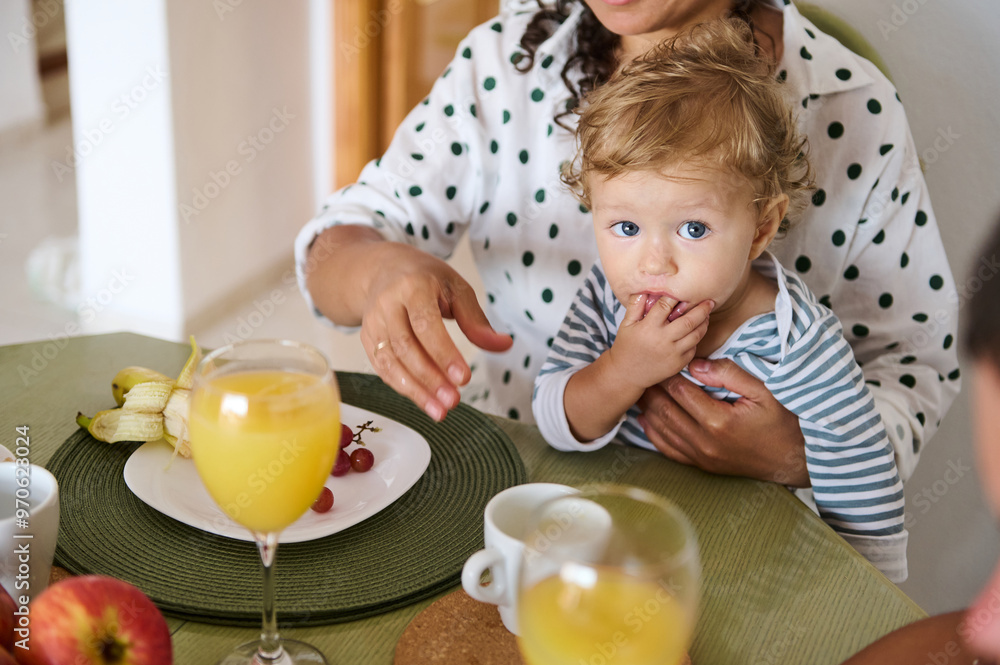 Mother and child enjoy a healthy breakfast together with orange juice and fruits at a cozy home kitchen table