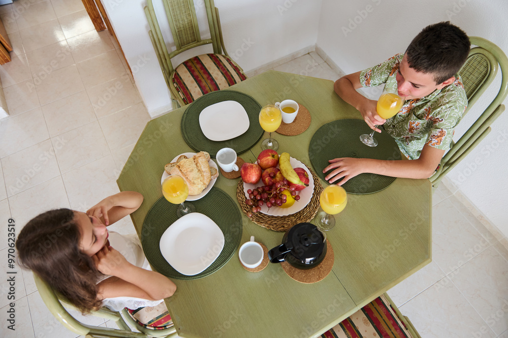 Children enjoying a healthy breakfast with fresh orange juice and fruit at a cozy dining table setting