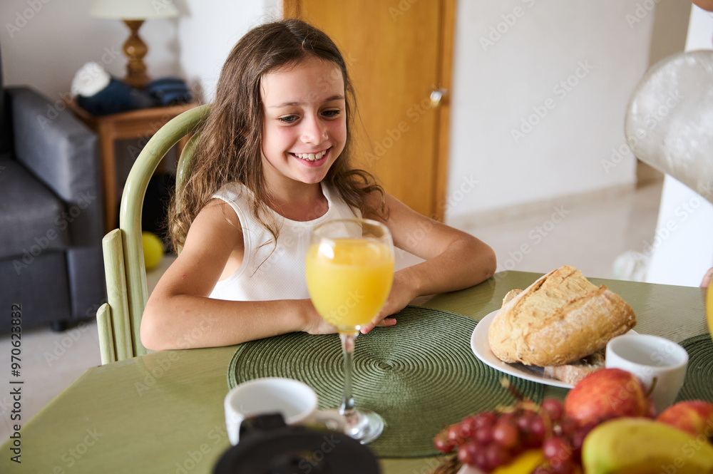 Smiling girl enjoying breakfast with fresh orange juice and bread in a cozy home setting