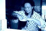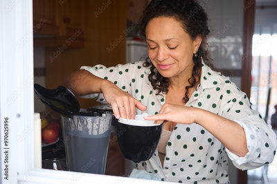 Woman preparing coffee at home using coffee maker, enjoying a peaceful morning routine in a cozy kitchen setting