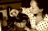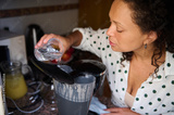 Woman preparing coffee by pouring water into a modern coffee maker in a cozy kitchen setting