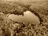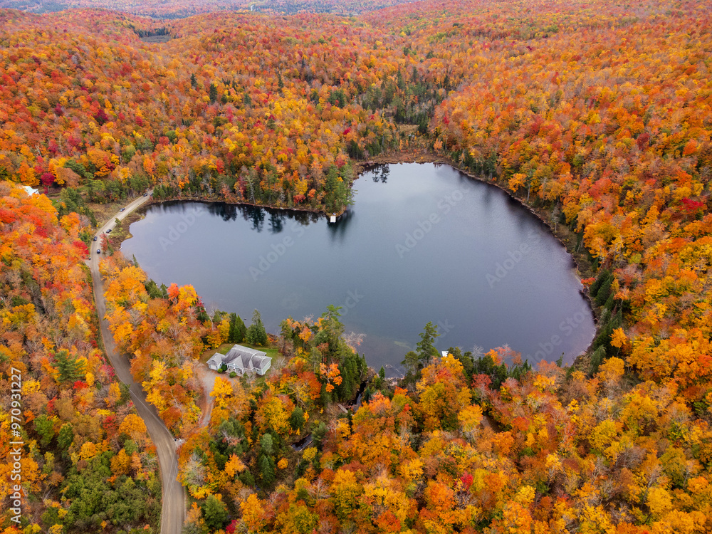 Aerial view of heart shape lake surrounded by autumn forest. Concept of earth day, love, environment, ecology. Baker Pond, Bolton-Est, Quebec, Canada.