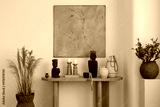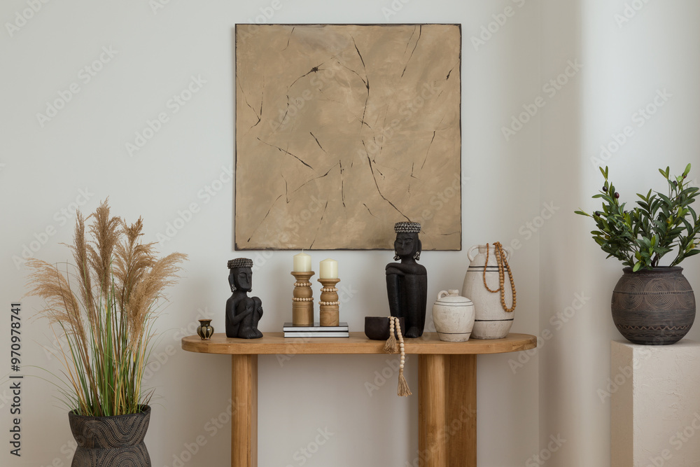 Ethnic-inspired decor with wooden table. A beautifully styled wooden table adorned with ceramic vases and Buddha sculptures, enhancing the room's bohemian vibe.