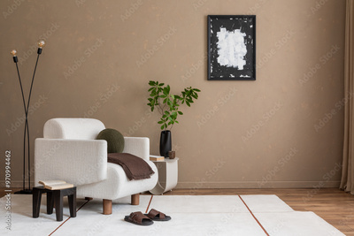 Minimalist Living Room Setup. Cozy armchair with a minimalist design against a neutral-toned wall, complemented by modern décor. Suitable for contemporary interior design themes.
