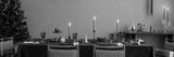 Christmas composition of dinning room interior with table with green table cloth, wooden console, christmas tree, wreath, cookies, candle with candlestick and personal accessories. Home decor Template