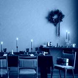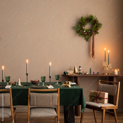 Christmas composition of dinning room interior with table with green table cloth, wooden console, christmas tree, wreath, cookies, candle with candlestick and personal accessories. Home decor Template