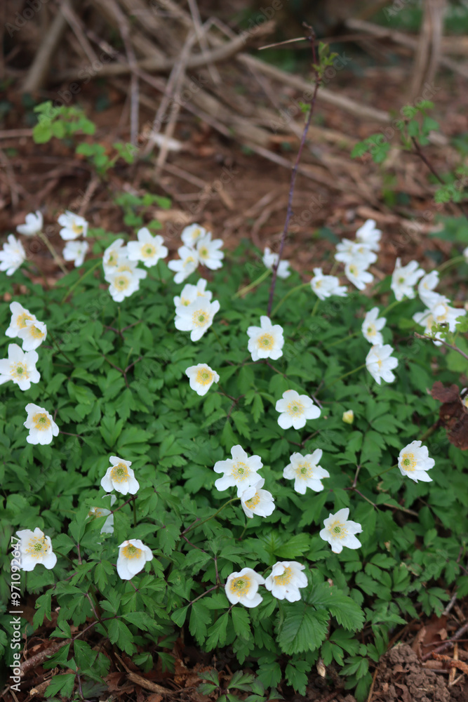 White wood anemone flowers during springtime. Anemone nemerosa in the forest