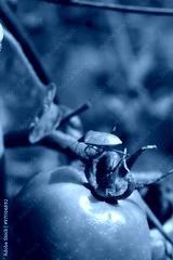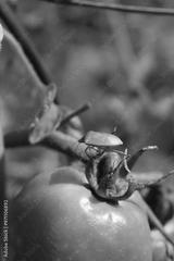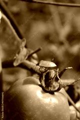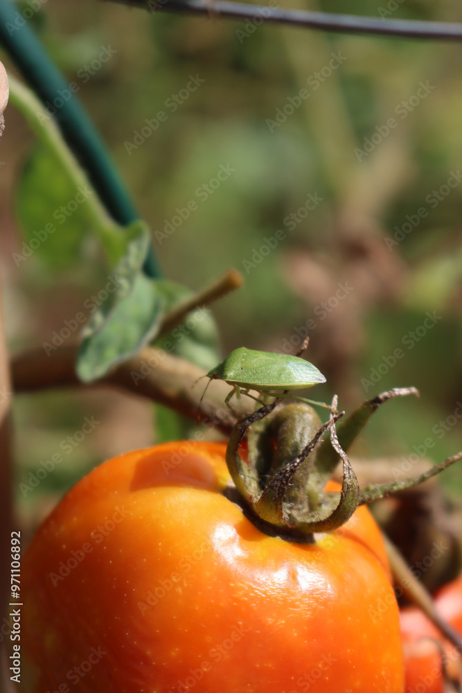 Close-up of green shield bug on a red damaged tomato in the vegetable garden. Nezara viridula insect