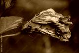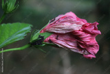 Close-up of faded red hibiscus flower on plant with many ants on petals