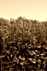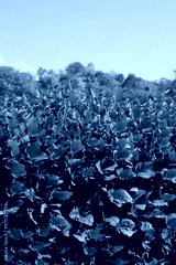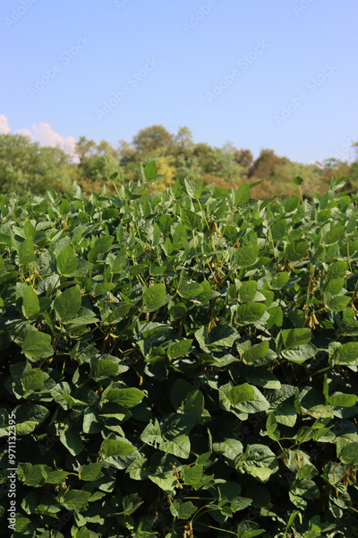 Green soybean field in bloom against blue sky, Glycine max on late summer