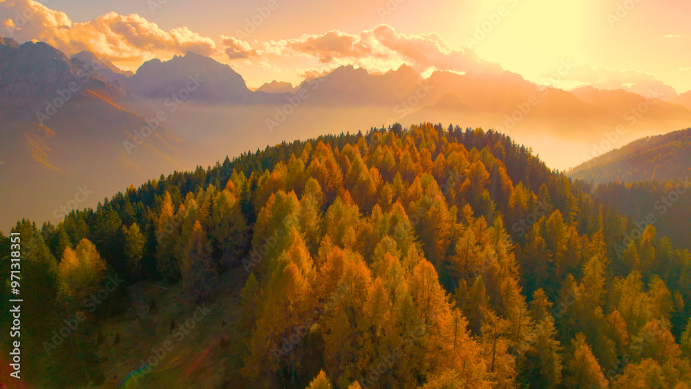 AERIAL: Golden sunset casts an ethereal glow over an autumn forest as majestic mountains rise in the background. Breathtaking view of glowing yellow larch trees and stunning mountain silhouettes.