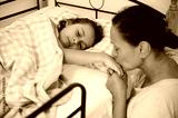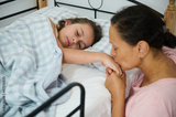 Caring mother kissing daughter's hand in bed showcasing love, comfort, and family bonding in a nurturing home environment