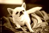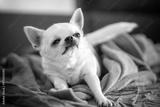 Biały piesek rasy chihuahua przeciąga się po drzemce