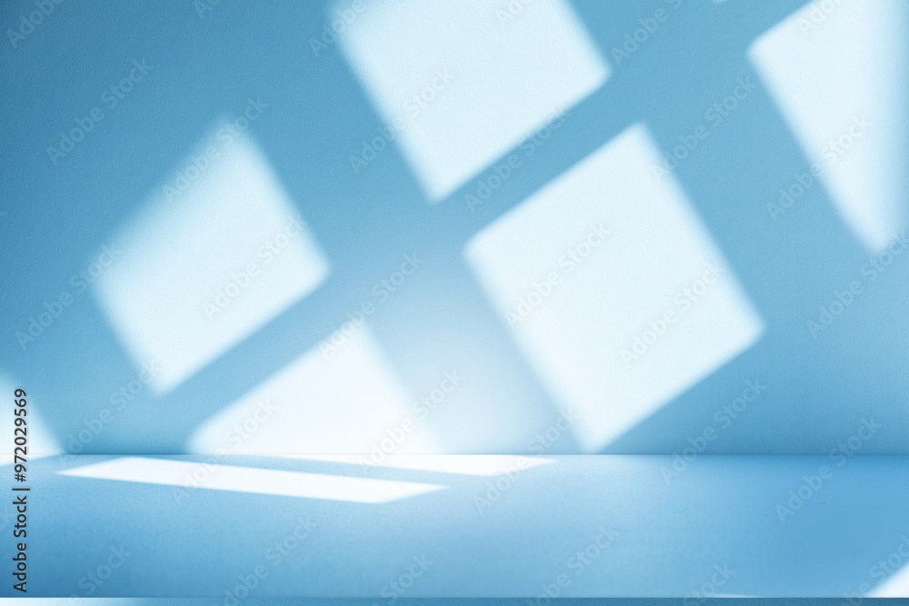 Studio style background wall decoration presentation uses white and blue tones. with shadows cast from a nearby window, concept creating a decorative backdrop.