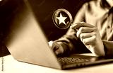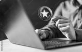 star, excellent, rate, ranking, quality, evaluation, feedback, result, review, satisfaction. A person is holding a magnifying glass over a laptop with a star on it. Concept of searching for something.