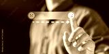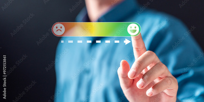 achievement, scale, analysis, diagram, efficiency, performance, progress, chart, graph, rating. A man is pressing a button on a screen that has a smiley face and a frowning face.