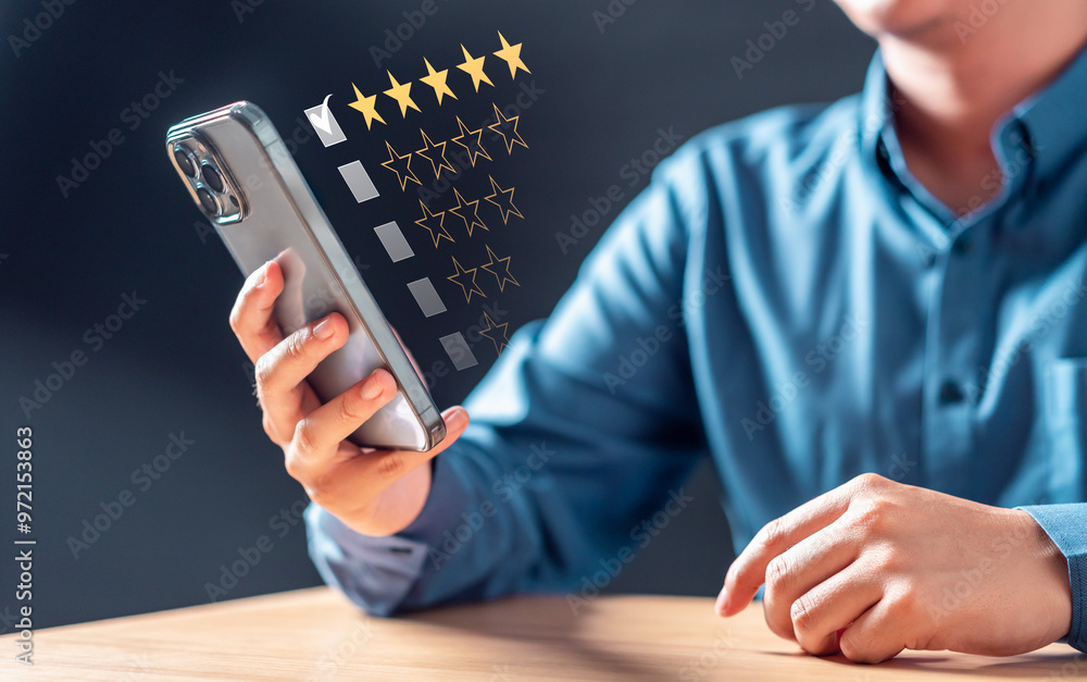 score, survey, vote, star, positive, appraisal, feedback, rank, review, result. A man is holding a cell phone with a star rating app on it. The app shows five stars and a thumbs up.