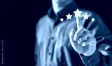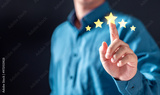excellent, give, rate, ranking, quality, evaluation, feedback, review, satisfaction, survey. A man is pointing at a five star rating. Concept of achievement and success.