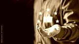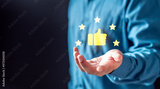 poll, rating, result, review, satisfaction, stars, survey, excellent, agreement, community. A man is holding up a hand with a thumbs up sign and stars. The image conveys a positive and uplifting mood.
