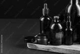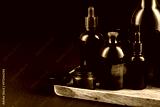 Collection of amber glass bottles arranged on a wooden tray against a dark background