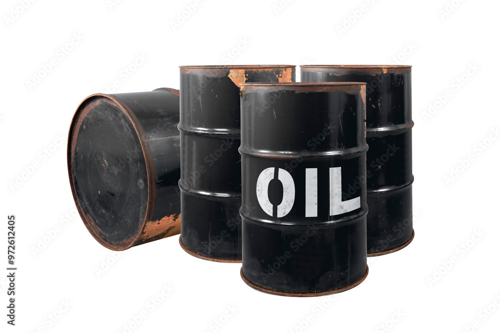 Barrel of oil. Rusty dangerous barrel with fuel or crude oil on isolated background