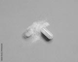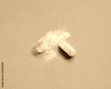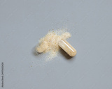 Opened Medical capsule to show beige powder on grey top view. Dietary supplements
