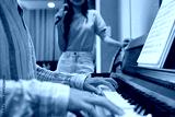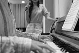 Person playing piano with sheet music while another person in background singing into microphone, capturing ambiance of music practice. Fingers on piano keys and focus on hands