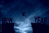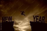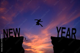New Year 2025, 2026, 2027, 2028 concept. Businessman jumping on cliff over the precipice at amazing sunset. Reopening for business and lifestyle, career path, change, starting, readiness of leaders