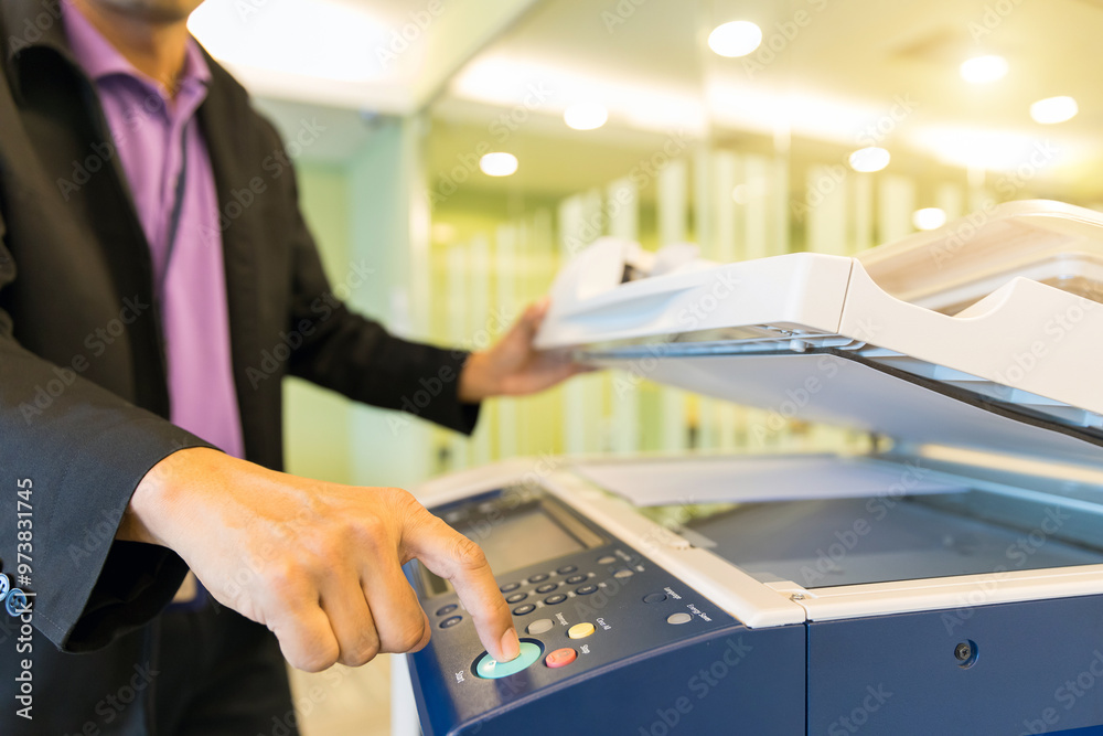 Man use copier or photocopier or photocopy in office workplace is equipment for copy duplicate Xerox or scanner to scanning document or printer for printing paper.