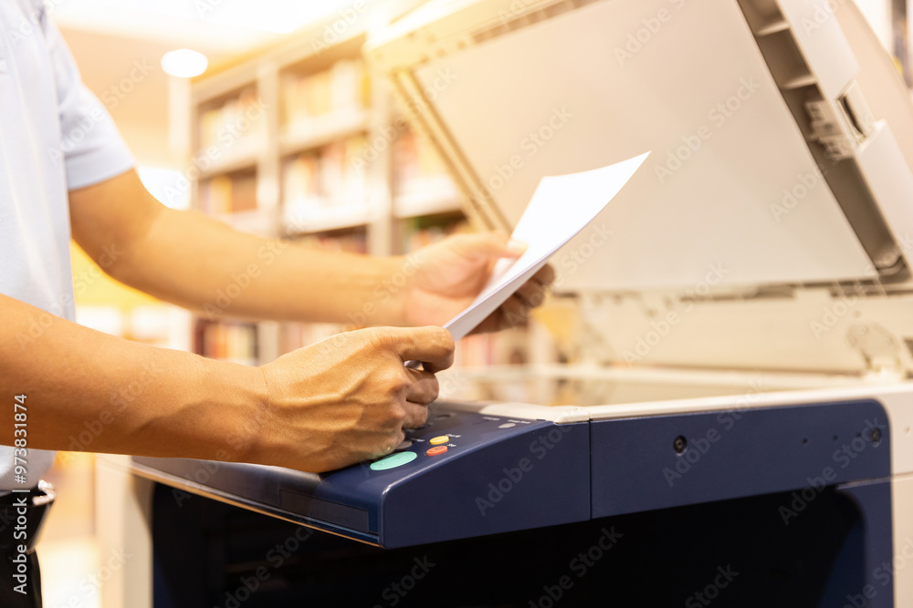 Man use copier or photocopier or photocopy in office workplace is equipment for copy duplicate Xerox or scanner to scanning document or printer for printing paper.