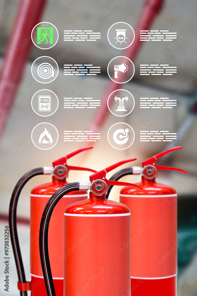 Fire extinguisher with prevent icons for protection or prepare fire equipment for prevention in emergency case and safety or rescue and alarm system training concept.