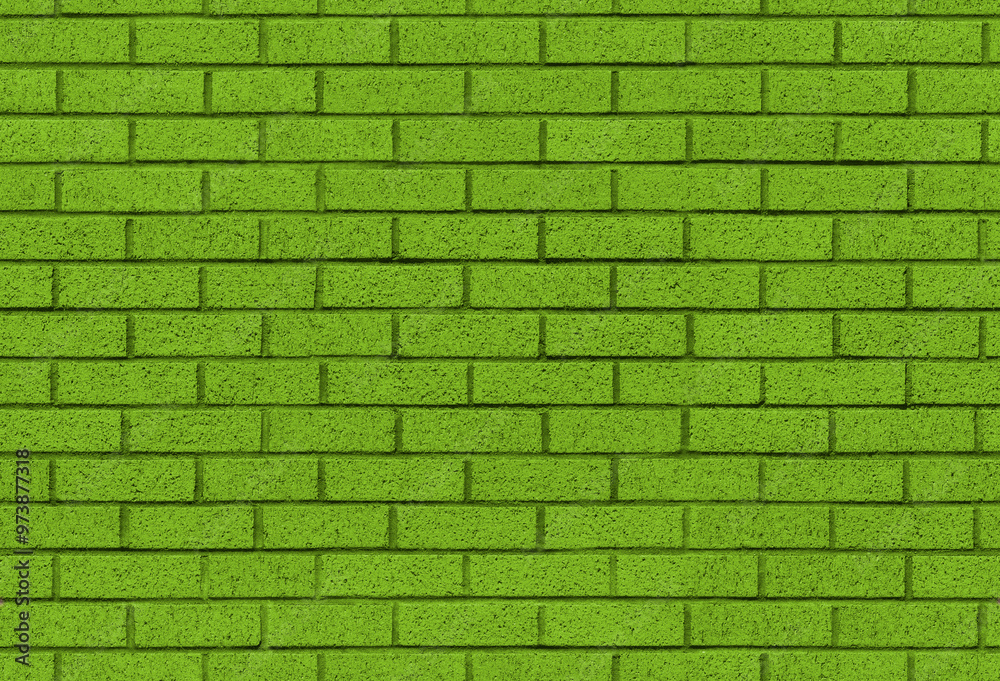 Green brick wall seamless background texture image. Green paint applied to block masonry surface. A modern interior and exterior and backdrop tile design. Built in running bond brickwork pattern.
