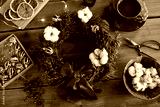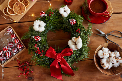 winter holidays, diy and hobby concept - close up of christmas fir wreath making stuff, decorations and hot chocolate on wooden table
