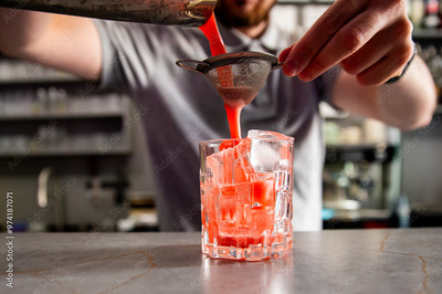 close-up shot of person pouring vibrant red liquid through strainer into glass filled with ice cubes, capturing the motion and color contrast. Perfect for beverage, refreshment, and lifestyle themes.