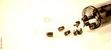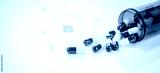 Red white capsules spilling from plastic bottle on white background. Prescription drugs and pharmaceutical regulations. Safety standards and efficacy requirements in modern healthcare. Health policy.