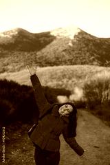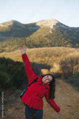 Cheerful latin woman opening arms in mountainous setting while hiking.