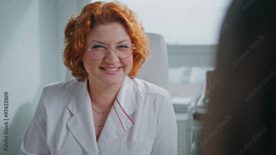 Healthcare professional consulting clinic visitor with friendly smile closeup.
