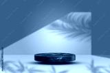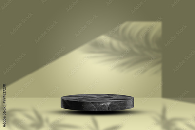 Composition with podium for design your cosmetic products with black marble stand with tropical leaves on green background with shadow.